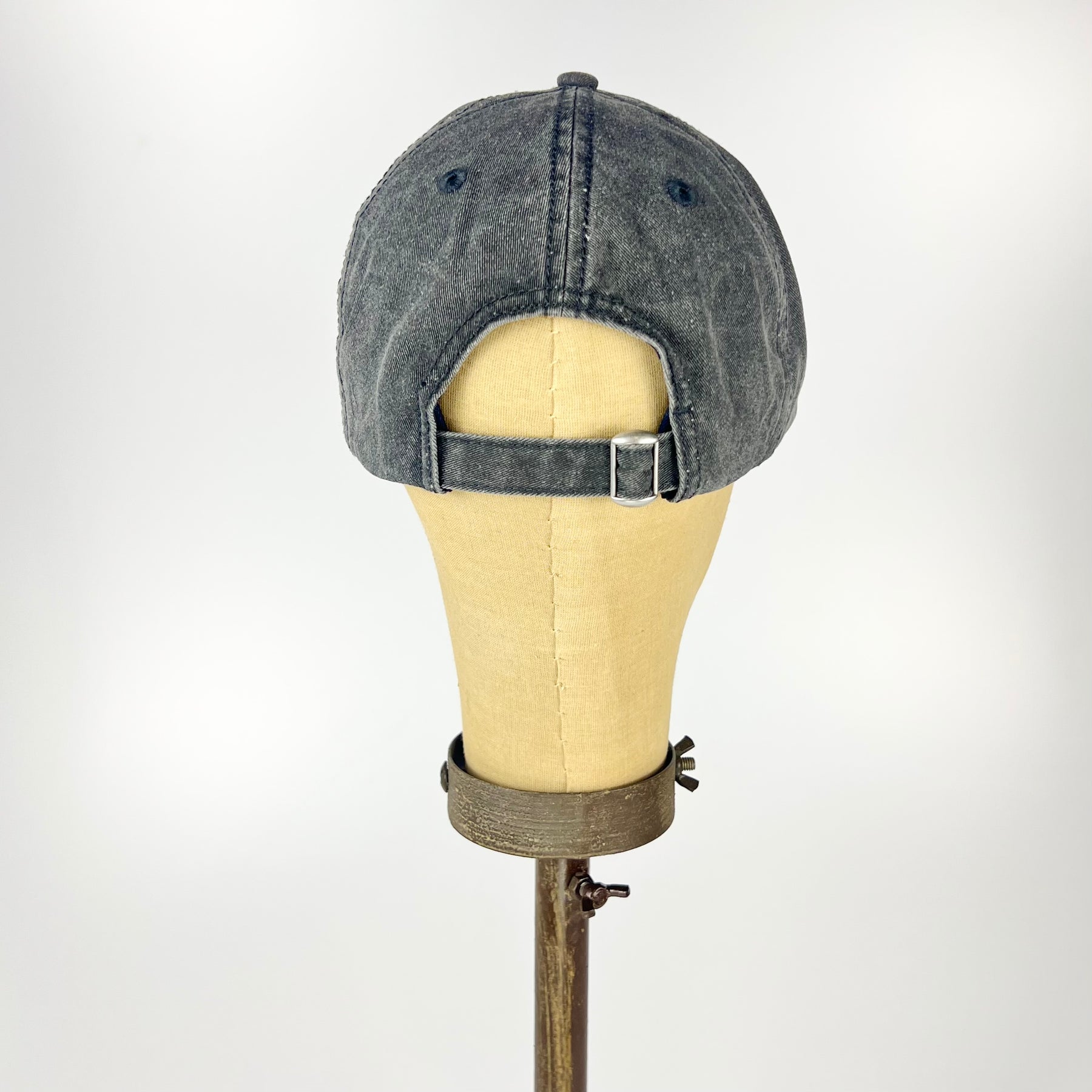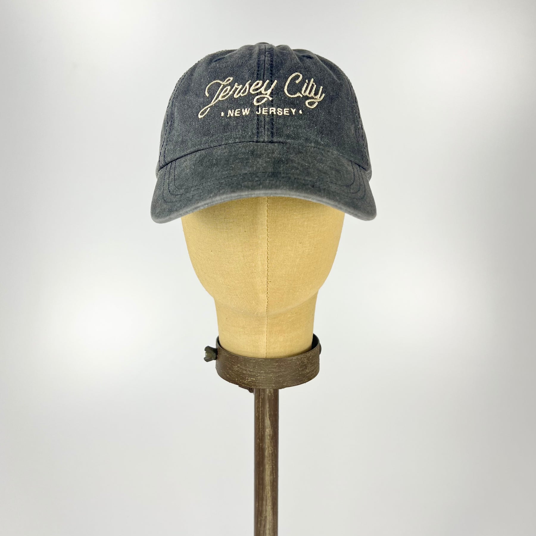 Unstructured faded black fabric dad cap with white embroidered Jersey City, New Jersey across the front.